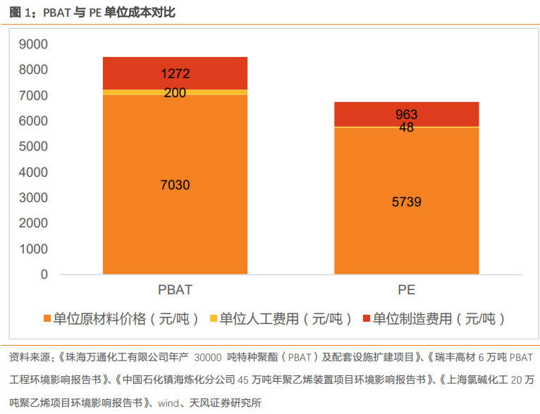 通过分析国内可降解塑料龙头金发科技的 PBAT 项目的生产物料平衡、 投资额及原材料价格,我们测算得出当投资设备满产时,PBAT 单位原材料成本、单位人工成本和单位制造费用共 8502 元/吨。