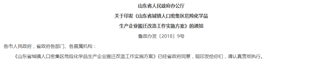 山东省人民政府办公厅印发《山东省城镇人口密集区危险化学品生产企业搬迁改造工作实施方案》,到2025年,城镇人口密集区现有不符合安全和卫生防护距离要求的危险化学品生产企业就地改造达标、搬迁进入规范化工园区或关闭退出(以下统称搬迁改造)。其中,中小型企业和存在重大风险隐患的大型企业2018年年底前全部启动搬迁改造,2020年年底前完成;其他大型企业和特大型企业2020年年底前全部启动搬迁改造,2025年年底前完成。
